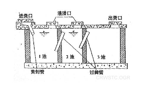 新鮮糞便由進(jìn)糞口進(jìn)入第一池,池內(nèi)糞便開始發(fā)酵分解、因比重不同糞液可自然分為三層,上層為糊狀糞皮,下層為塊狀或顆狀糞渣,中層為比較澄清的糞液。在上層糞皮和下層糞渣中含細(xì)菌和寄生蟲卵最多,中層含蟲卵最少,初步發(fā)酵的中層糞液經(jīng)過糞管溢流至第二池,而將大部分未經(jīng)充分發(fā)酵的糞皮和糞渣阻留在第一池內(nèi)繼續(xù)發(fā)酵。流入第二池的糞液進(jìn)一步發(fā)酵分解,蟲卵繼續(xù)下沉,病原體逐漸死亡,糞液得到進(jìn)一步無害化,產(chǎn)生的糞皮和糞厚度比第一池顯著減少。流人第三池的糞液一般已經(jīng)腐熟,其中病菌和寄生蟲卵已基本殺滅。第三池功能主要起儲(chǔ)存已基本無害化的糞液作用。的作用